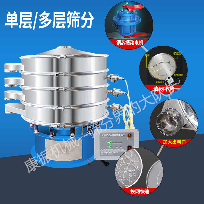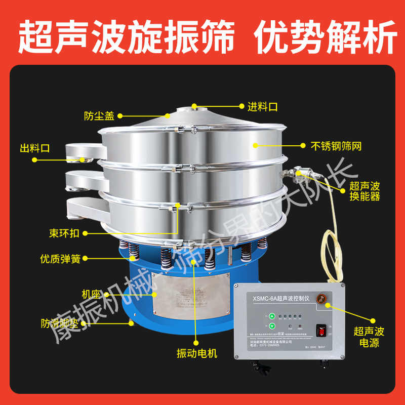 超聲波振動篩是將220V、50Hz或110V、60Hz電能轉化為36KHz的高頻電能,輸入超聲換能器,將其變成36KHz機械振動,產生的功率超聲波使篩網作高頻振動。篩網上的物料在作低頻旋振運動的同時,疊加上超聲振動,既可防止網孔堵塞,又可使篩分機提高產量和質量,從而達到快速篩分和清網的目的,使超微細粉篩分成為易事。該系統在傳統的振動篩基礎上在篩網上引入一個低振幅、高頻率的超聲振動波(機械波),以改變超微細分體的篩分性能。特別適合高附加值精細分體的用戶使用