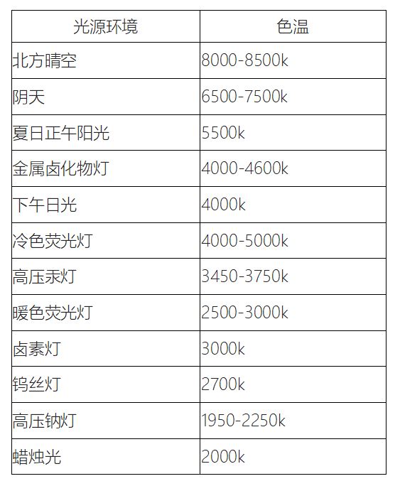 3. 不同光源環(huán)境的相關色溫度光源色溫參數表