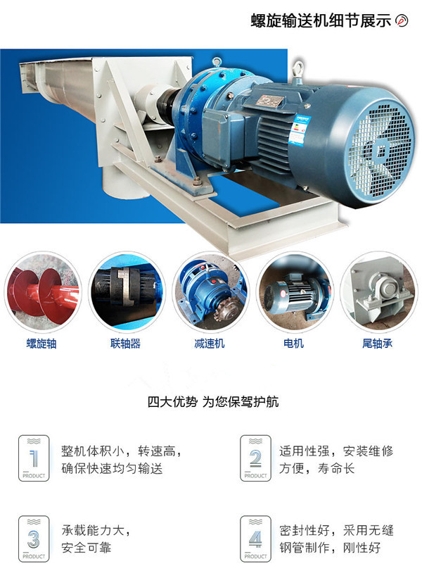 LS型螺旋輸送機結構特征,一臺螺旋輸送機通常由本體、進出裝置、驅動裝置三大部分組成。本體由首節、中間節、尾節三種組成。在首節內裝有支推軸承承受軸向力,在中間節和尾節內裝有用軸承支承螺旋軸,此外,在尾節內還裝有可軸向移動的徑向軸承以補償螺旋軸長度的誤差和適應溫度的變化。各螺旋軸之間采用法蘭式聯接,提高聯接軸的互換性,便于維修。