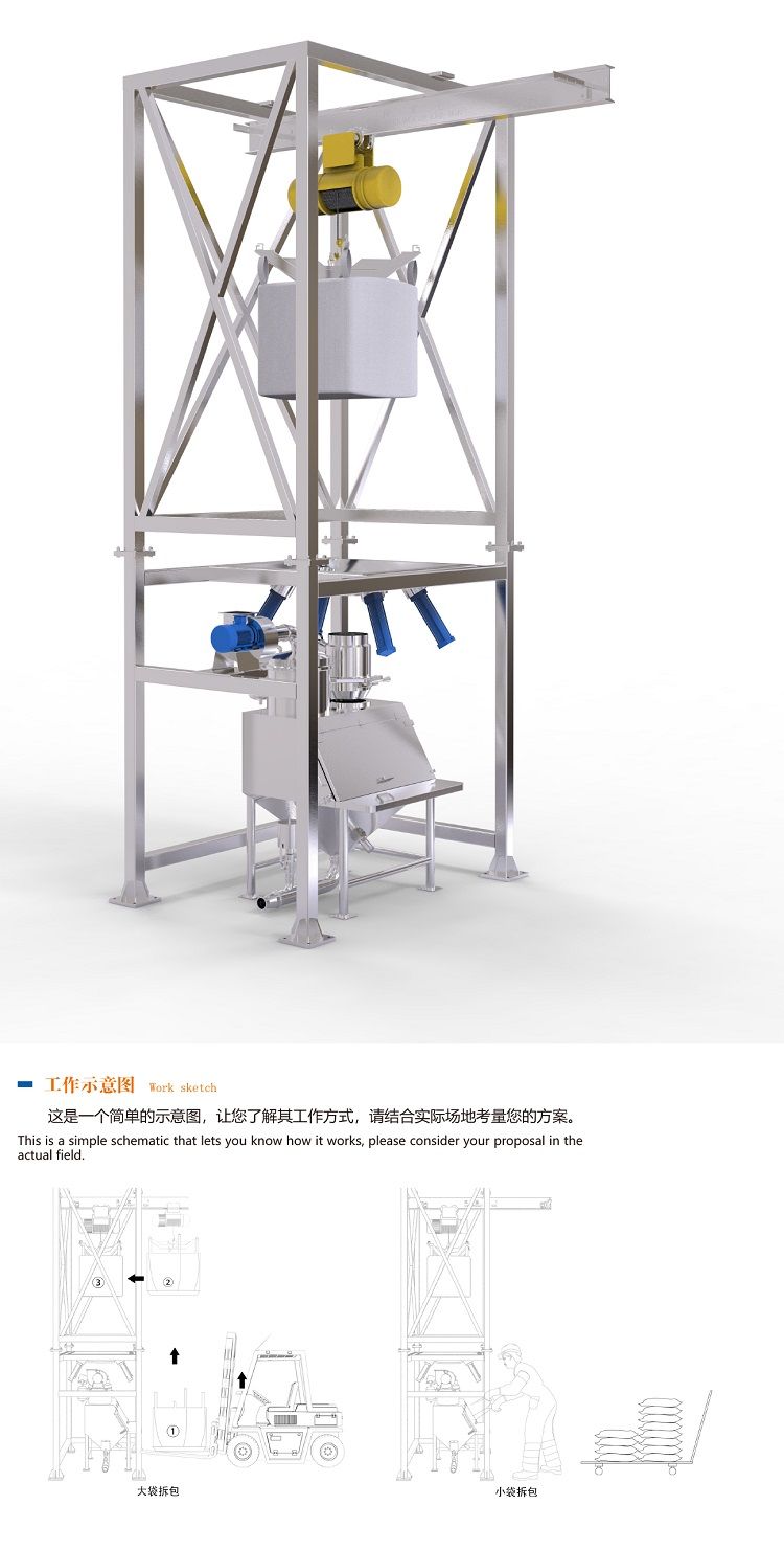 結構:噸袋卸料投料站用于噸袋裝粉狀、顆粒狀物料拆包卸料作業。該設備由機架、提升裝置、隔膜閥、暫存料倉等組成;根據工藝特點和設備尺寸,可以采用吊機和叉車兩種不同的方式; 可配有雙軌道,用于兩只電動葫蘆安裝的場合中,提高拆袋效率;材質分為碳鋼和不銹鋼兩種;整套設備密封性好,操作簡便,極大的提高了生產環境和生產效率。