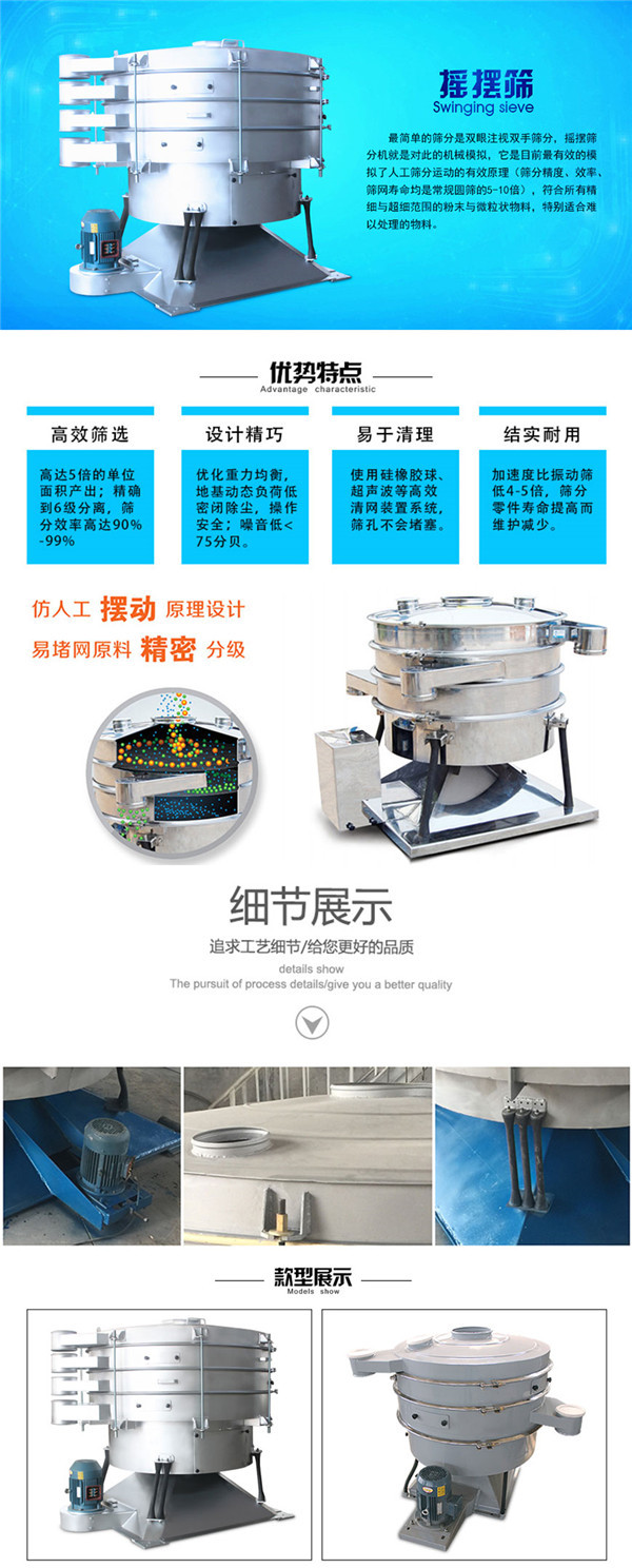 即可調節偏心距的激振器產生了非線性三維運動,物料也產生同樣的近似手動作業的運動,從而達到篩分之目的,再配合篩分附件可得到更加理想的篩分效果;適合于圓球狀、圓柱狀、片狀、乃至不規則形狀易堵網且需要精密篩分的物料。